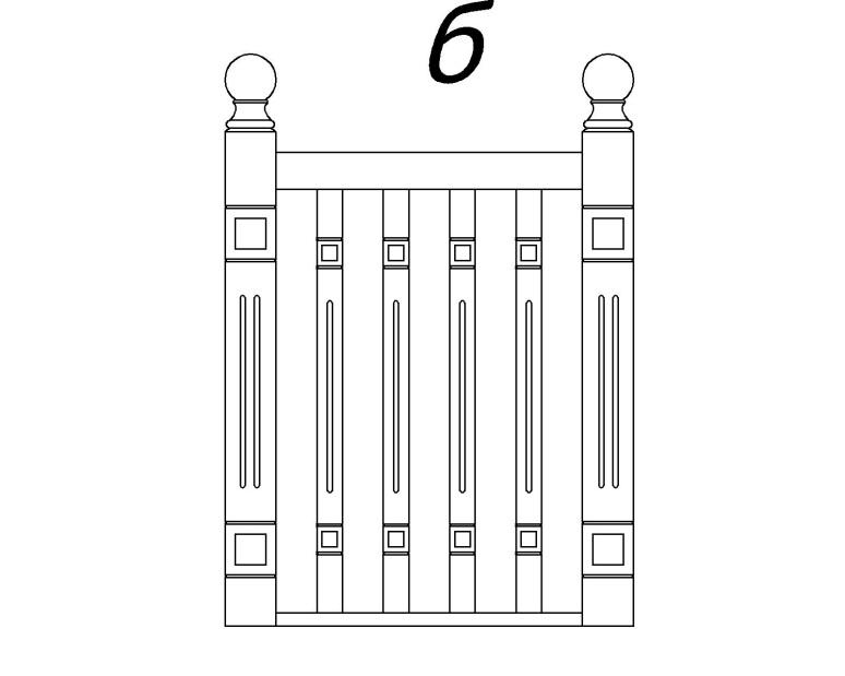 Рис. 1 Образцы ограждений. Варианты: а) ограждение с точеными балясинами, б) ограждение с балясинами прямого сечения, в) ограждение без балясин, с перекладинами, г), д), е) ограждение с резными балясинами.